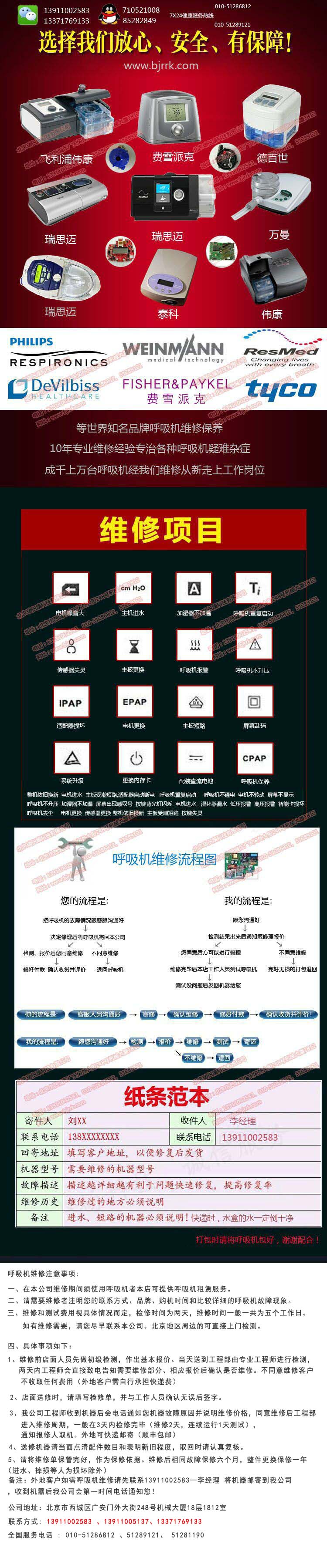 1、维修前店面人员先做初级检测,作出基本报价。当天送到工程部由专业工程师进行检测,两天内工程师会直接致电告知需要维修部分、相应报价后确认是否维修。不同意维修客户取回呼吸机,不收取任何费用。(外地客户需自行承担快递费)